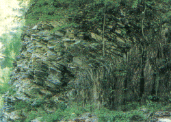 斜面上の岩盤がゆるんで少しずつ下方に動く現象をクリープと言います。力学で定義されるクリープとこのような地質学上のクリープとは内容が異なりますから注意してください。粘板岩や結晶片岩のようなぺらぺら剥げやすい片状岩が受け盤(写真のように地層の傾斜方向が斜面の傾斜方向と反対の場合のこと)をなすところでしばしば見られます。斜面表層が少しずつ滑る訳ですから、樹木は