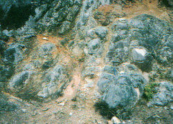 花崗岩やアルコーズ質砂岩・安山岩のような比較的均質な岩石では、しばしば玉ねぎ状に風化するコアストーン構造(玉石)が見られます。地表付近が一番風化していて、深部に行くほど新鮮になるのは当然ですが、コアストーンは上右図のように中間帯(Zone B)で典型的に発達します(福井克樹,1997修論)。一つ一つのコアストーンを見ると、外形は節理系に支配され、節理に近いほど風化が進んで砂状になっていますが、芯にあるコア部との中間に玉ねぎの皮に当たる球状剥離部が発達します。節理に沿って地下水が浸透したため、風化が進んだのでしょう。顕微鏡のオーダーでも、やはり割れ目から風化が進むことが観察されます。ここでも自然界がフラクタルなことが分かります。