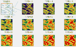 そこで、横田修一郎島根大学総合理工学部教授(元本講座助教授)は、節理に由来する風化の過程をコンピュータシミュレーションで再現しました(Yokota, 1993)。時間の経過と共に、節理面付近から風化が進行していくことがよく分かります。
