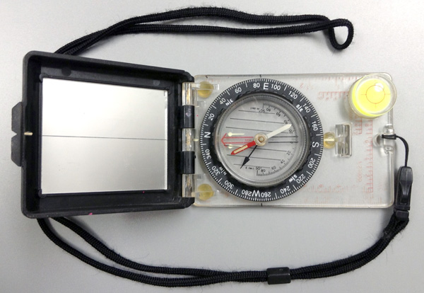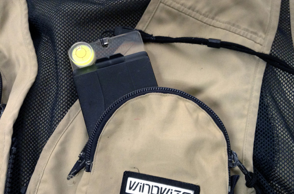 コンパス紛失の経緯はこうでした。最後の水流を渡るために枯木で橋を架けました。枯木を引き起こして直立させたときに枝がコンパスの紐にひっかかり、そのまま枯木を向こう岸に倒したのでポケットからコンパスが引き出されて少し離れた場所に落下したのです。コンパスが落ちたときの音は、枯木が倒れる音にまぎれてしまって気づかなかったようです。下の写真はベストの胸ポケットにコンンパスを入れた状態を再現したものです。