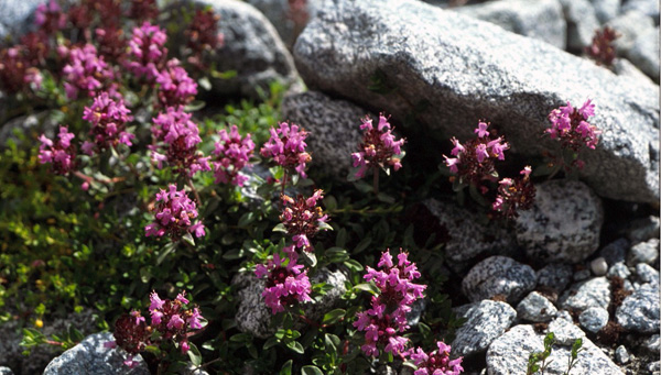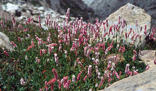 8月11日 カンディア側のBarkleyまで10時間以上かかることがわかっているので、チャイだけで朝食を済ませ、まだ薄暗い5:30にSirikartを出発します。来るときに下って来た道は帰りは急な登り道になるのですが、順調に進んで7:55に峠を通過できました。その先の氷河を降り始めたところで、シラージがザマーンの通訳(パシュトー語→ウルドゥ語)で語ったことによると、「このあたりでイギリス人二人と現地のガイド一人がクレバスに落ちて死んだ。」ようです。そもそも私のウルドゥ語が不充分なのに加えて二重の通訳ですから、詳しいことは分かりません。人が死んだ話を聞かされながら峠の直下を通過していたときに、強烈な腐敗臭が漂ってきたので周囲を見回すと、ロバと羊の死体がそれぞれ一頭ずつ地面に転がったまま放置されていました。死因はわかりません。ここではちょっとした手違いで死ぬことになりそうなので、できるだけ速やかに、ただしクレバスに注意を払いつつ移動します。危険地帯を抜け出したら調査をしながら歩き、時間をかけて谷を降りていきます。下の画像は峠付近の岩の隙間に咲いていた花です。種名はわかりません。