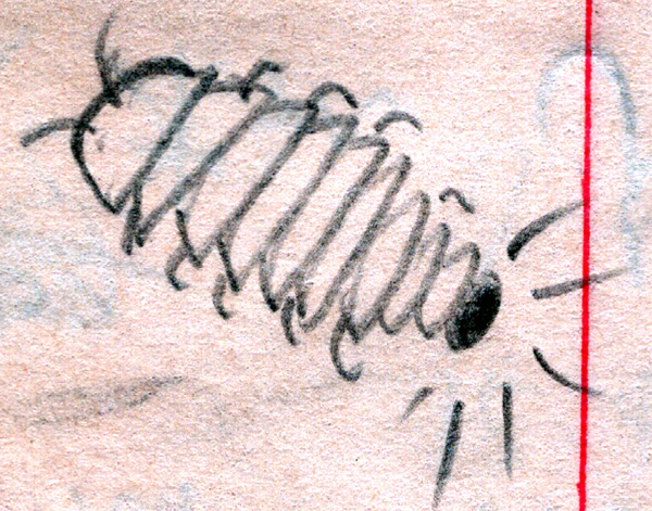 コンパスが見つかる可能性を少しでも高めるために、ザマーンとワドゥドの通訳を介してBarkleyの長老格と思われる老人に「自分の作業を近くで見ていた子供達がコンパスを拾っていないか?」ということ調べてもらうことにしました。小さな集落ですから、どこの家の子なのかはすぐにわかるようです。その依頼を終えると寝ることにしたのですが、身体は疲れているのに意識が高ぶって寝付けません。深夜にトイレのために起きてモスクの裏手に回って少し離れた場所で用を足していると、足下で何かが動いているような気配がします。蛍が放つような緑がかったほのかな光が点滅しながらたくさん動いていました。その場にしゃがみ込んで暗さに慣れてきた目でよく見ると、ダンゴムシとフナムシを合成したような姿をした虫の尻の先端が蛍のように光っています。体長は大きいやつで3 cmくらいだったと思います。あまりの不気味さに、捕獲して写真を撮る気にはなれませんでした(その場では暗すぎて撮れない)。翌朝に記憶を呼び起こして描いたスケッチが下の画像です。ザマーンにそれを見せて尋ねたら、「それはメシーだ。」と言います。ただし、「メシー」は「虫」という意味なので説明になっていません。