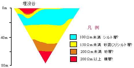上図は玉利池の海側にある鹿大植物園内で電探をかけた結果です。左がコープガイド側ですが、そこにはっきりと埋もれ谷が認められます(井上・他,1990)。玉利池からあふれ出た水が流れ出していた川の跡でしょう。古甲突川の支流です。