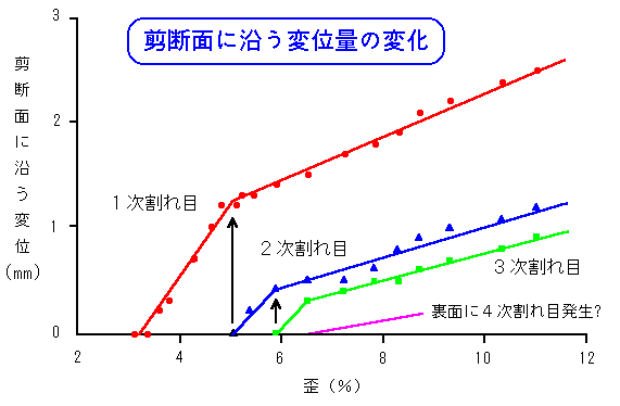 次に、割れ目に沿って平行に測った変位量と歪みの関係を見てみましょう。1次割れ目だけしかない間は、当然歪みはこの1次割れ目に沿う変位で解消しますが、2次割れ目が形成された瞬間から、1次割れ目に沿う変位量が減少します。2次割れ目に沿う変位が一部歪みを受け持ってくれるからです。3次割れ目発生のときも同様です。つまり、新しい割れ目が発生すると、平均変位速度が減少するのです。活断層の平均変位速度から地震の再来周期を論ずることがありますが、個々の断層ごとに再来周期を論ずるのは問題がありそうです。その地域の断層系全体が歪みを解消していると考えるほうが妥当なのではないでしょうか(岩松・山田,1989)。