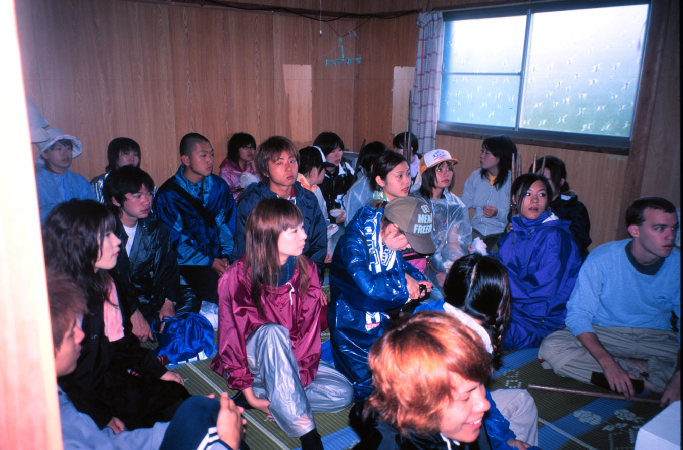 雨天のためカッパを着て全員大広間に集合する